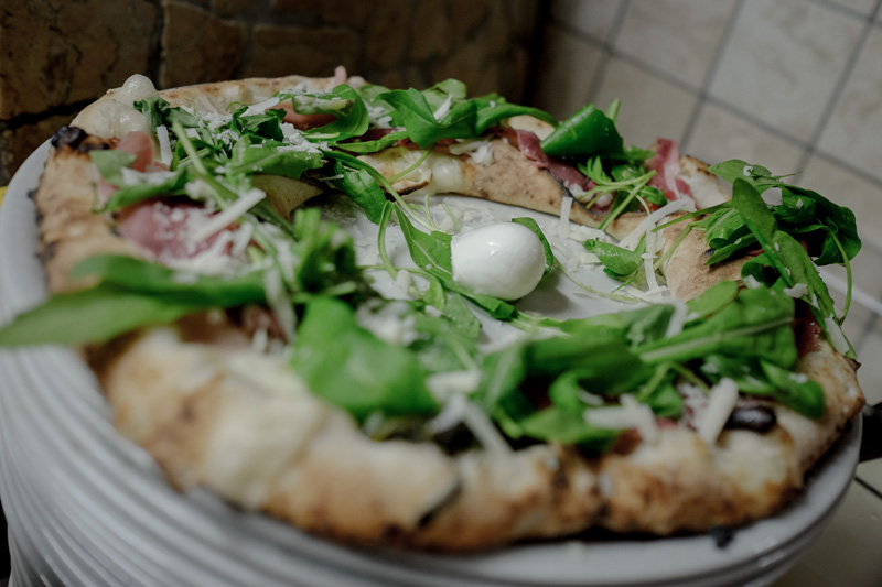 Pomodoro datterino fresco, provola affumicata. All’uscita: prosciutto crudo, rucola e scaglie di Grana Padano