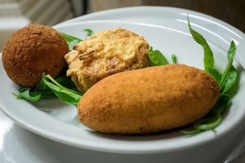 Zucchine, fiori di zucca, crocchè, frittatina e arancino