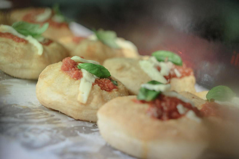 Straccetti di pasta fritta con pomodorino, Mozzarella di Bufala, scaglie di Grana Padano e olio evo
